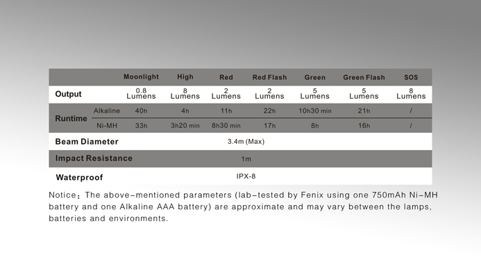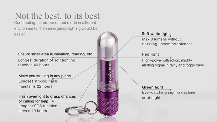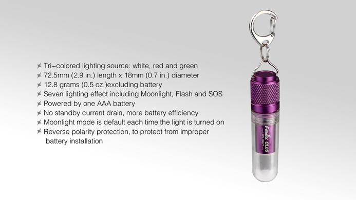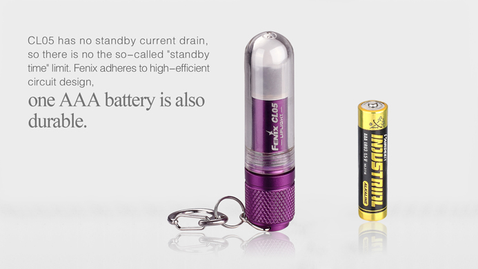 De Fenix CL05 is een nieuw type lamp dat het midden houdt tussen een kampeerlamp en een sleutelhangerlamp voor dagelijks gebruik en is een ideaal lampje om altijd op zak te hebben. Met drie kleuren diffuus licht is de lamp ideaal te gebruiken als lamp om gezien te worden of als EDC lampje om te voorkomen dat je struikelt in het donker. De lamp biedt drie standen wit licht (laag, hoog en S.O.S.), twee standen rood licht (vast en knipper) en twee standen groen licht (vast en knipper). Door de knipperstanden val je extra op en wordt je beter gezien in het donker. De lamp werkt maximaal 40 uur op 1 (meegeleverde) AAA penlite. Dankzij de meegeleverde sleutelhangerclip en volledige waterdichtheid volgens IPX-8 norm kun je de lamp probleemloos meenemen op al je avonturen of buiten in de regen laten staan, liggen of hangen. De lamp is ontwikkeld zonder 'standby current drain' om ervoor te zorgen dat je batterij niet leegloopt wanneer je de lamp tijdelijk niet gebruikt.