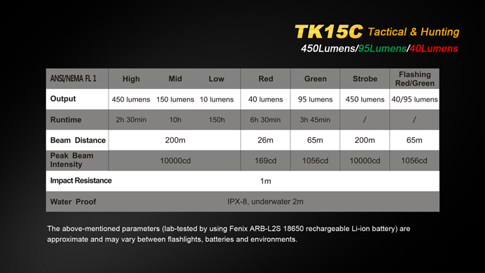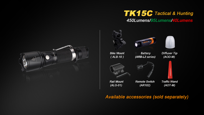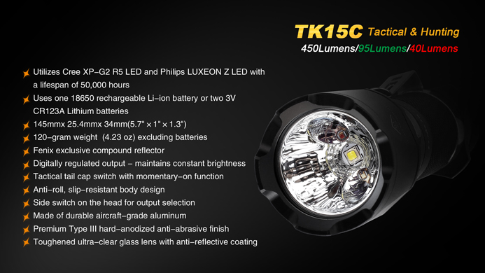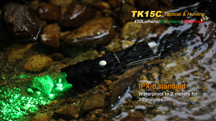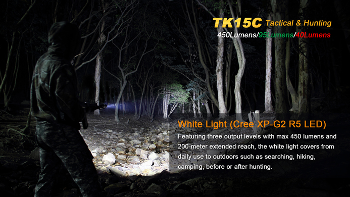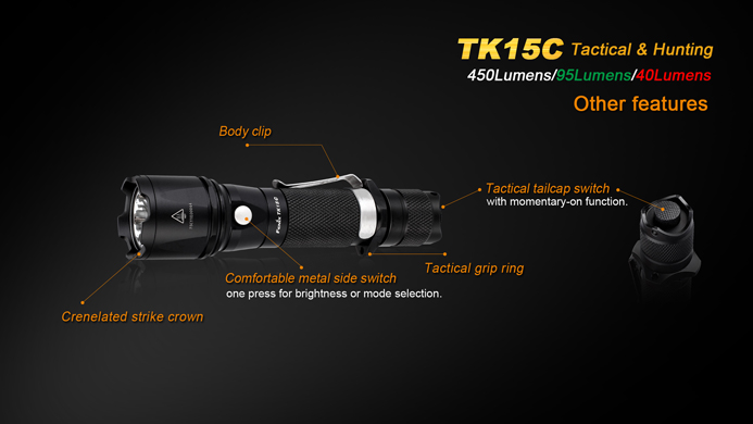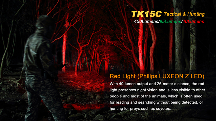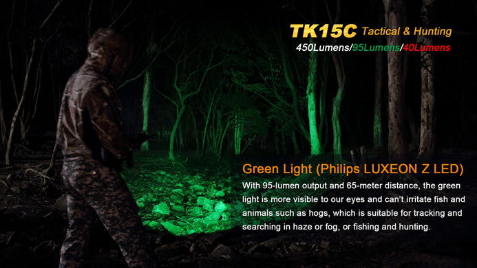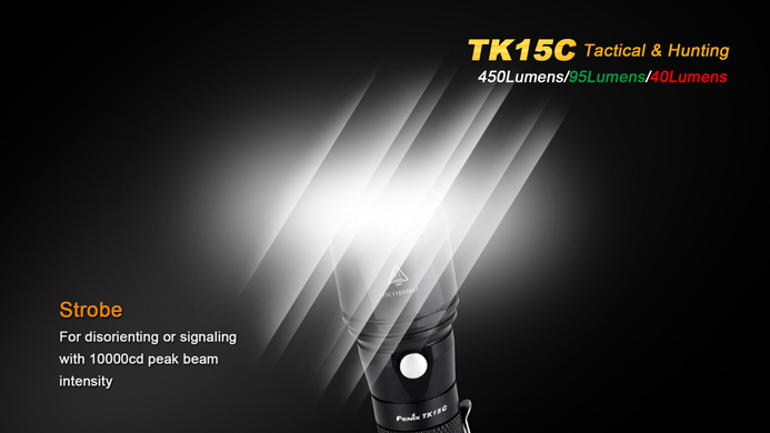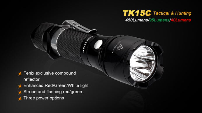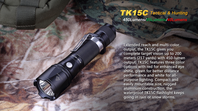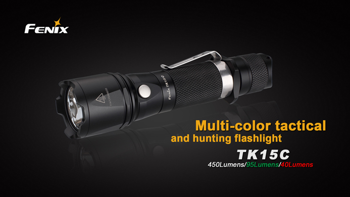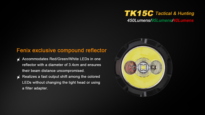 De Fenix TK15C is een tactische LED-zaklamp met naast wit licht ook rood en groen licht. Het model is zoals de naam al doet vermoeden geïnspireerd door de razend populaire Fenix TK15. Qua uiterlijk zien we dan ook weinig verschil. Wanneer je echter in de lampkop kijkt zie je naast de standaard witte LED ineens 2 losse LEDs in de reflector. Deze rode en groene LED maken deze TK15C een stuk veelzijdiger dan zijn voorganger. De C in TK15C staat dan ook voor colour.