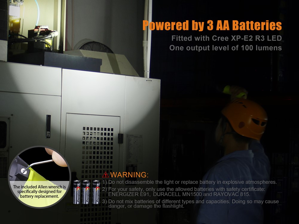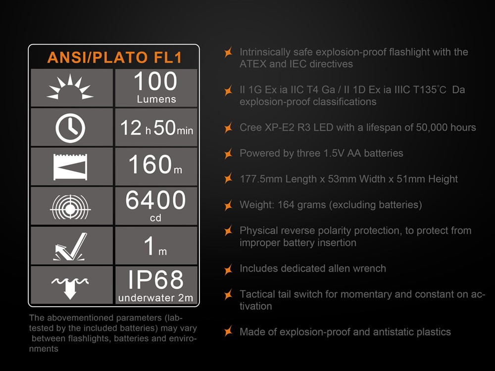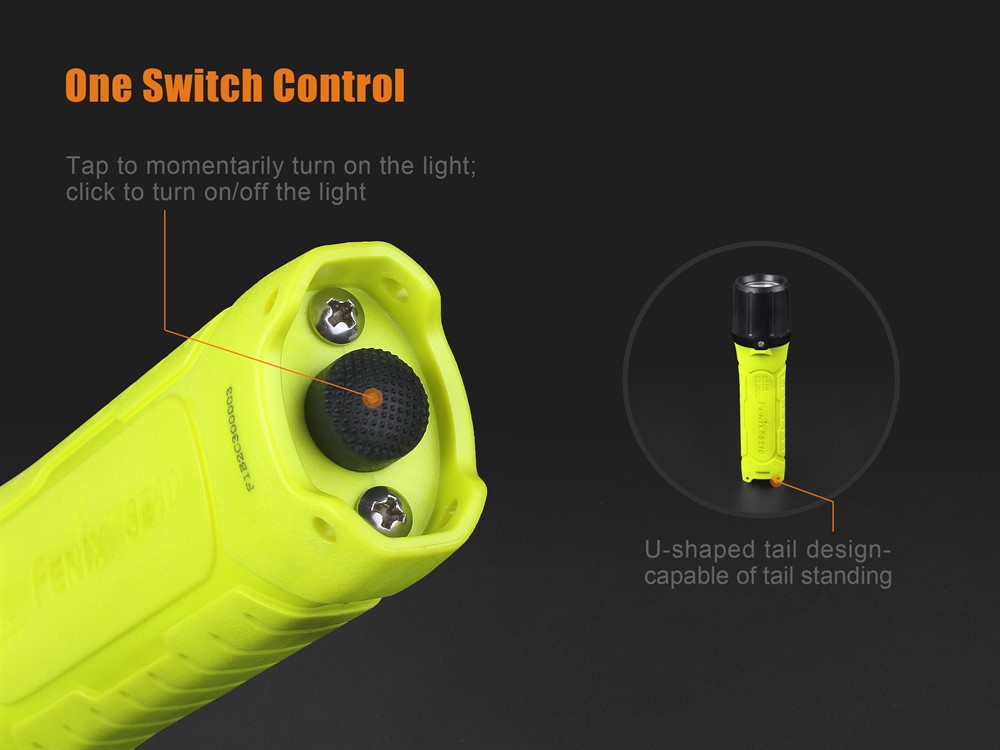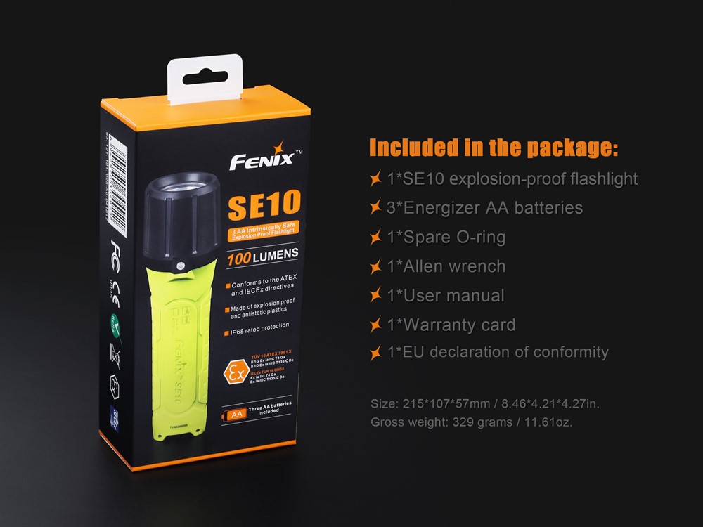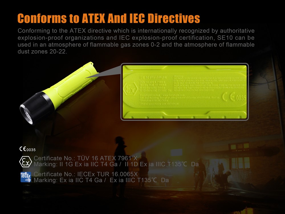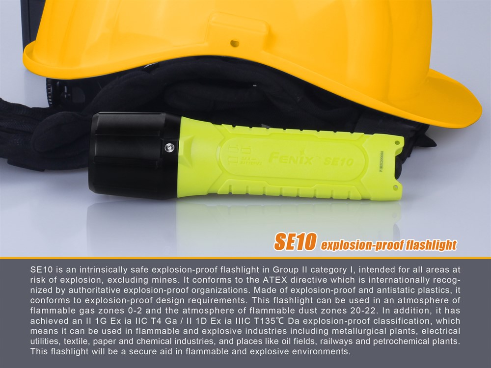 De SE10 is een ATEX-lamp die veilig te gebruiken is in gas zone 0-2 en stof zone 20-22. Afgezien van gebruik in mijnen is de lamp in iedere omgeving met verhoogd explosiegevaar in te zetten. De volledige classificatie is II 1G Ex ia IIC T4 Ga / II 1D Ex ia IIIC T135℃ Da. De lamp is vervaardigd uit explosieveilig en antistatisch kunststof. Met slechts 1 lichtstand is de lamp eenvoudig te bedienen en extreem betrouwbaar. De Fenix SE10 is een onmisbaar stuk gereedschap voor electriciens, petrochemici, brandweerlieden en werknemers in industrieën met verhoogd risico op explosie door stof en/of gas.