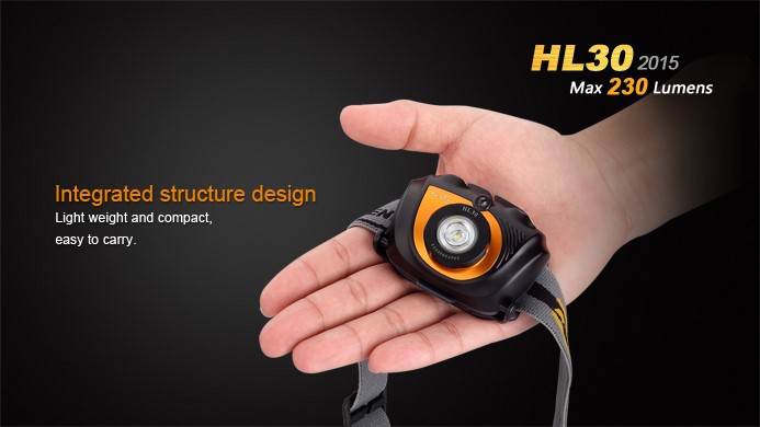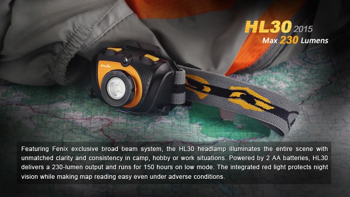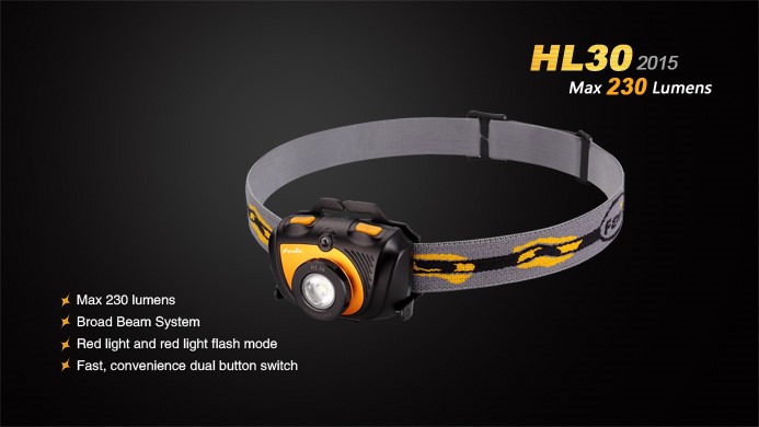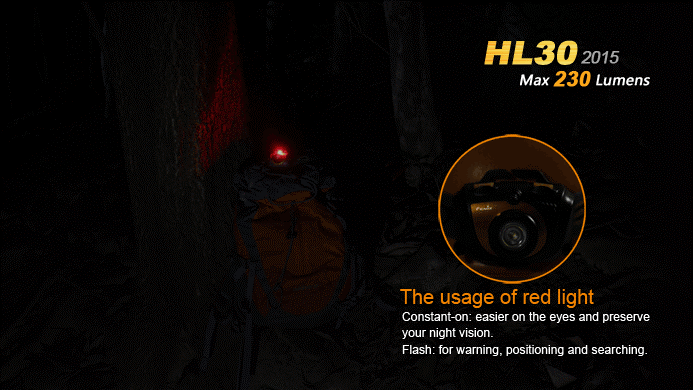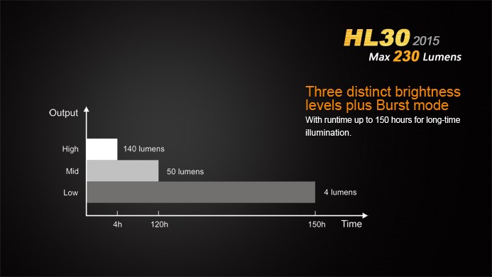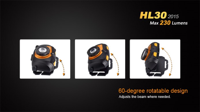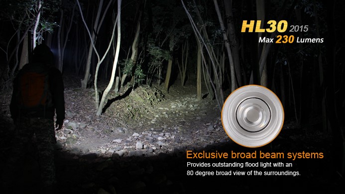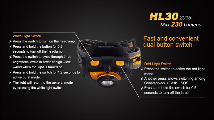 De Fenix HL30 is een zeer krachtige hoofdlamp met een maximum lichtopbrengst van 230 ANSI* lumen. De lamp is speciaal ontwikkeld voor outdoor hiking. Het bijzondere aan de HL30 is dat hij beschikt over 2 kleuren licht. Er zijn naast de 4 ‘normale’ lichtstanden ook nog een SOS-stand en een lichtstand met rood licht. De HL30 geeft een vrij brede lichtbundel.
